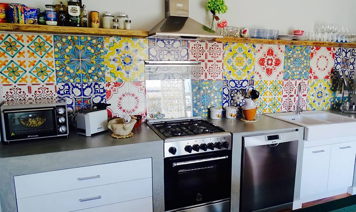 La cucina è allegra, colorata ed originale. È stata realizzata in muratura e rivestita con della resina cementina ed unitamente alle antine bianche rappresenta la parte più 'moderna' della casa.