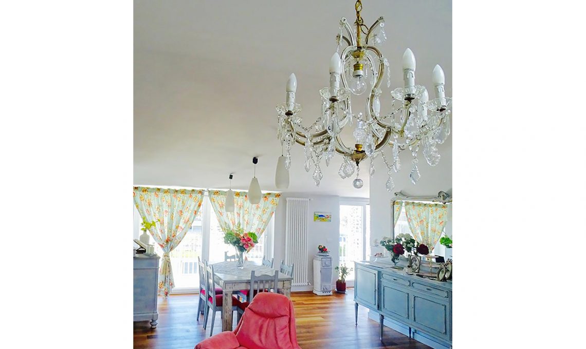 "Il progetto della casa nasce dalla passione per il mio lavoro. Mi occupo di arredamento e decorazione di interni in stile shabby-chic interpretato sia in chiave classica che moderna. L’appartamento è mansardato, in tutti gli ambienti c’è il parquet in legno color noce ed una tinta grigio polvere (colore di cui sono follemente innamorata) riveste le pareti.