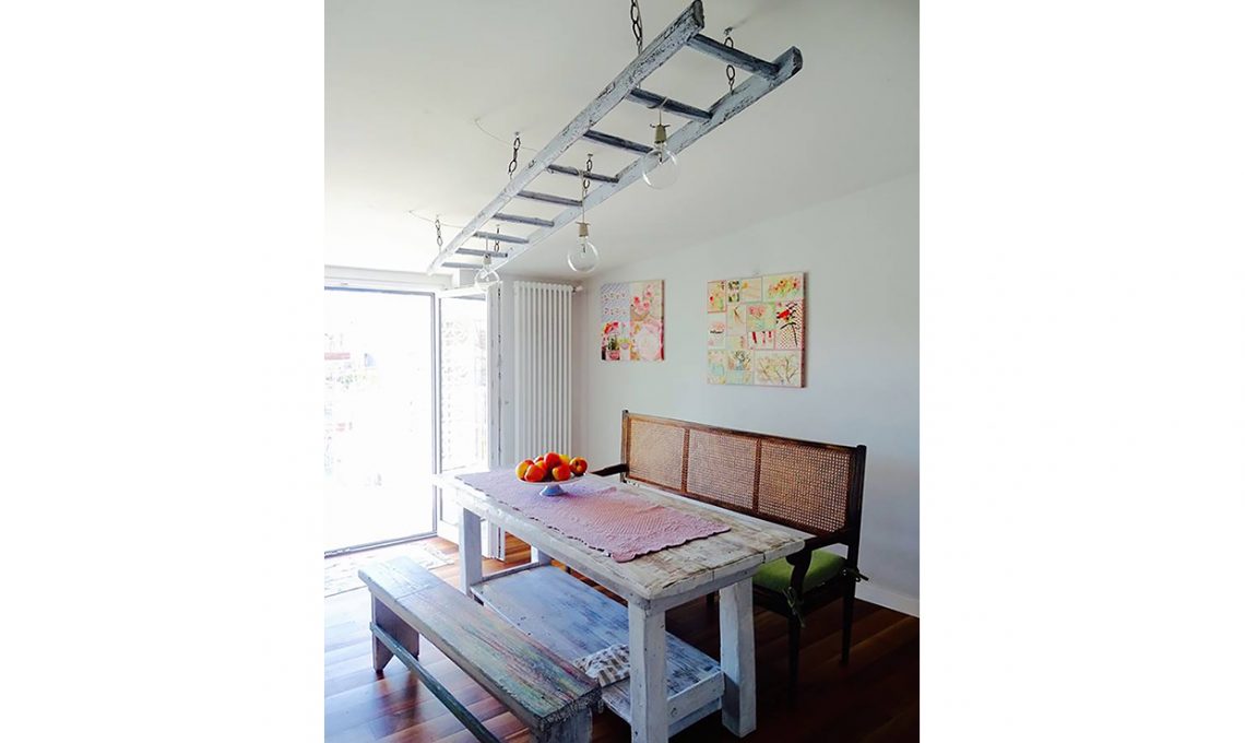 "La panca con il cuscino è stata acquistata in un vecchio convento mentre il panchetto è stato realizzato creando sulla seduta tutte le tonalità presenti nelle mattonelle. Al soffitto c’è una vecchia scala di campagna con luci intrecciate che fa da lampadario. Nel salone sono presenti mobili antichi decapati, c’è una vecchia cassapanca che funge da tavolino, un divano chesterfield vintage nella tonalità verde inglese, un armadio antico che è diventato una cristalliera, una toilette da bagno che funge da svuota tasche...