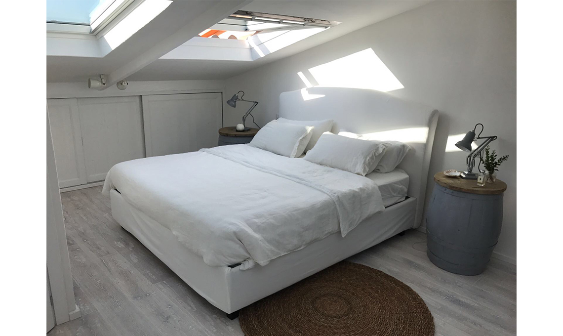 Abbiamo buttato giù tutte le pareti e il solaio disegnando interamente ogni spazio a nostra immagine e somiglianza secondo i nostri gusti. La casa si compone di due piani di cui uno con soppalco, con poche pareti e tante finestre a soffitto così ampie che si può vedere il cielo sopra di noi con stelle infinite che cadono sul nostro letto.