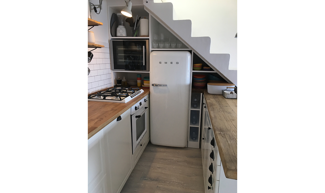 Le tre camere sono piccole, abbiamo dato maggior spazio alla zona living. Il sottoscala sfrutta ogni spazio e ogni nicchia per realizzare una cucina ultraccessoriata assecondando una delle nostre passioni, il buon cibo e il buon vino. I bagni sono due, piccoli ma confortevoli le docce grandi e spaziose, la lavanderia piccolissima ma funzionale, dotata di lavatrice e asciugatrice. Infine ci sono ampi armadi a muro per organizzare vestiti, borse e scarpe (altra mia passione).