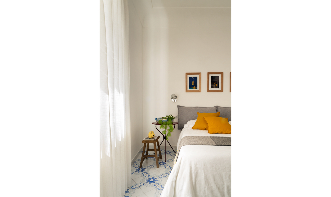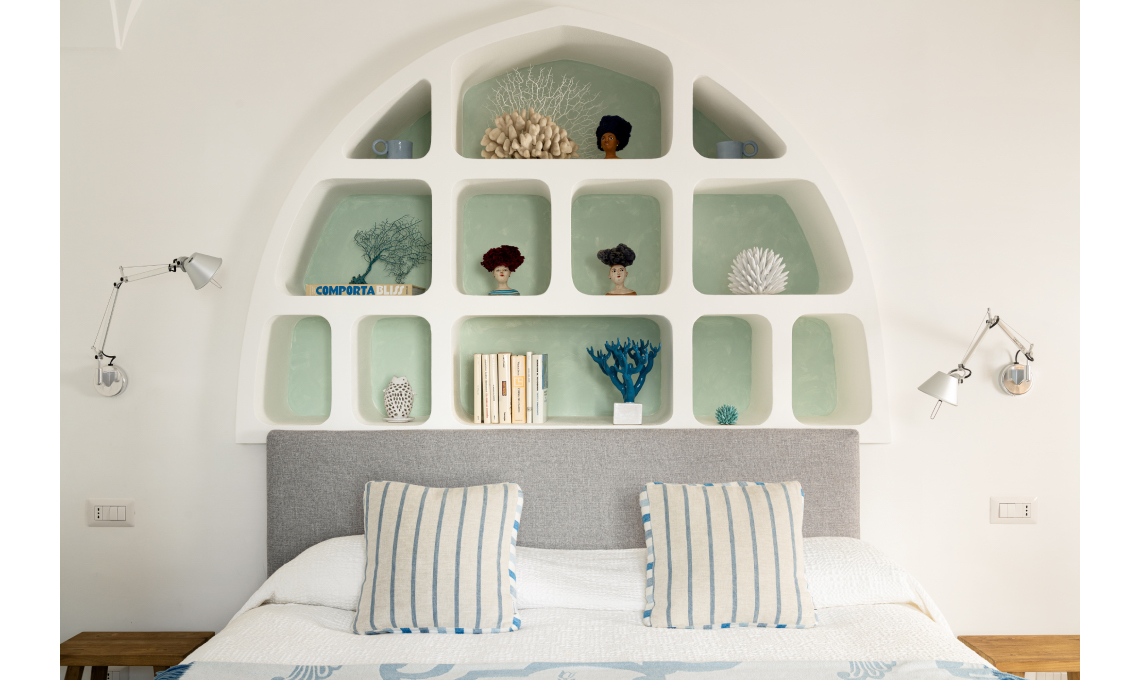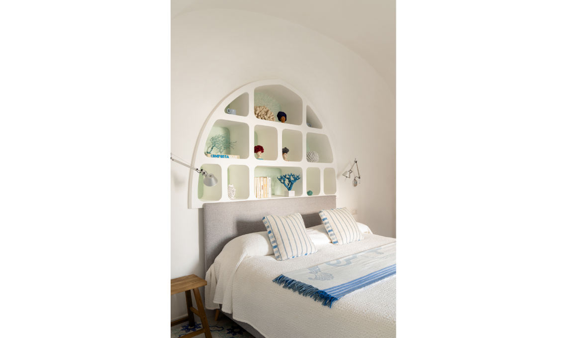 In una delle due camere da letto una parete di nicchie accoglie elementi e piccoli accessori di ceramica della costiera, come le "donnine" di Paolo Sandulli.