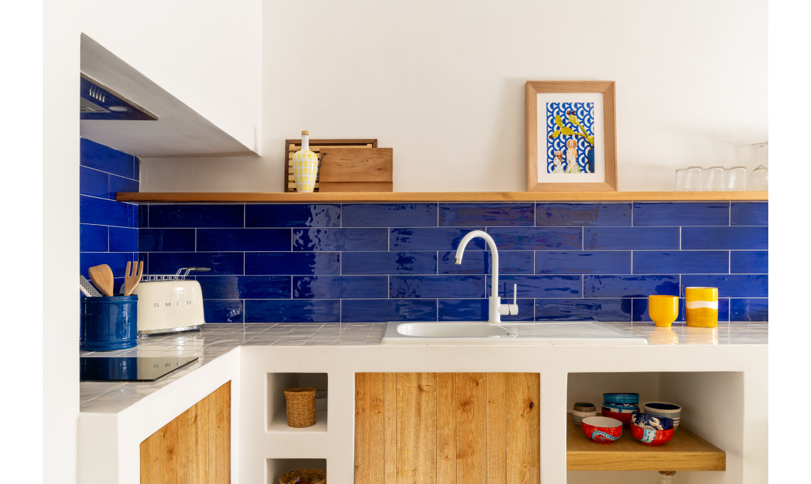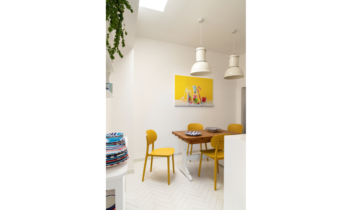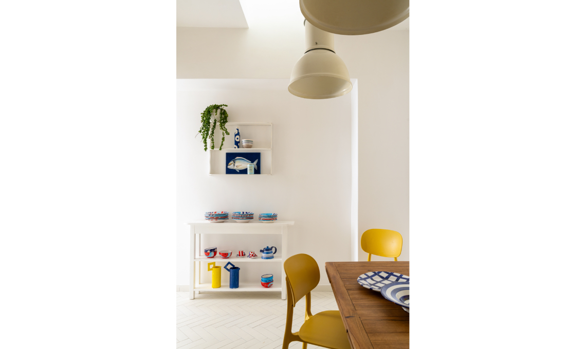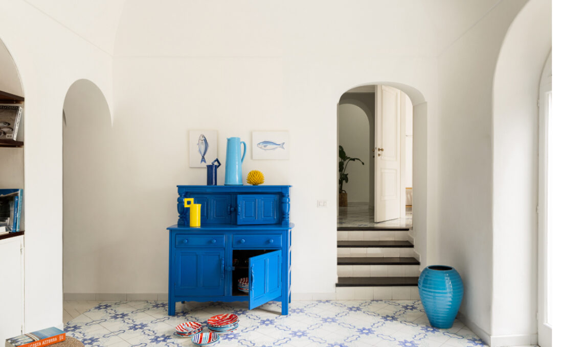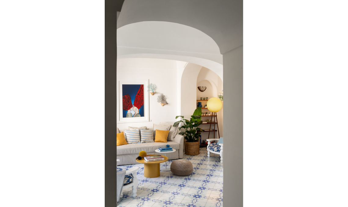Oltre alla ricerca attenta dei colori, tra i quali predominano il blu mediterraneo, l'azzurro e il giallo, il progetto si caratterizza per il recupero di arredi ritrovati nella cantina di famiglia, che sono stati mixati con arredi più contemporanei, per la valorizzazione del pavimento in ceramica vietrese, per i vasi e gli elementi strutturali come archi e nicchie.
