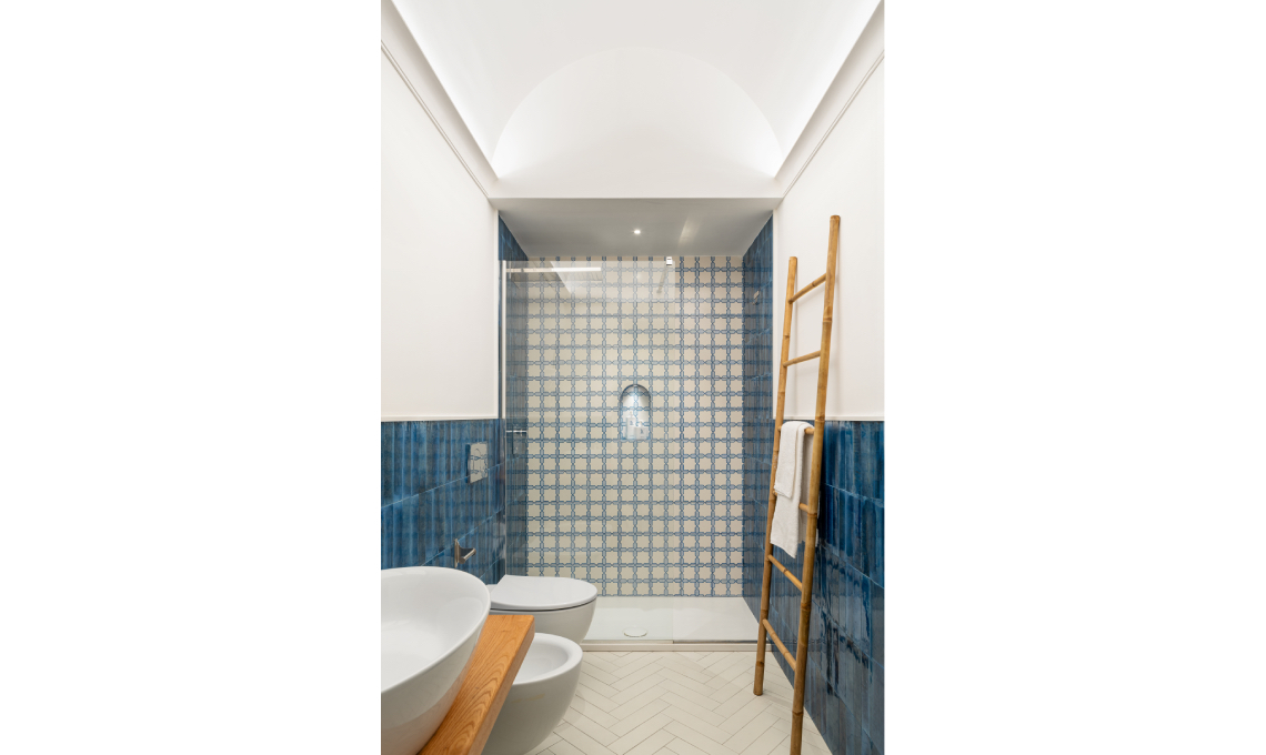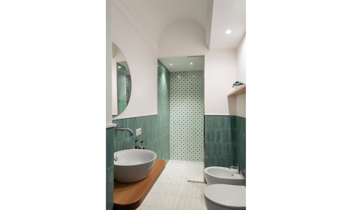 I bagni riprendono i colori predominanti della casa turchese e blu: entrambi sono rivestiti con mattonelle Marazzi finitura lucida, mentre nelle docce un rivestimento decorato dell'azienda costiera Ceramica Arcea. Sanitari bianco lucidi di ceramica Catalano e rubinetteria Zazzeri.