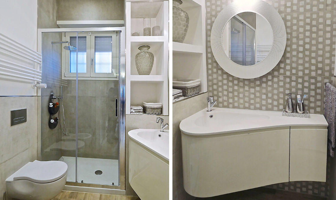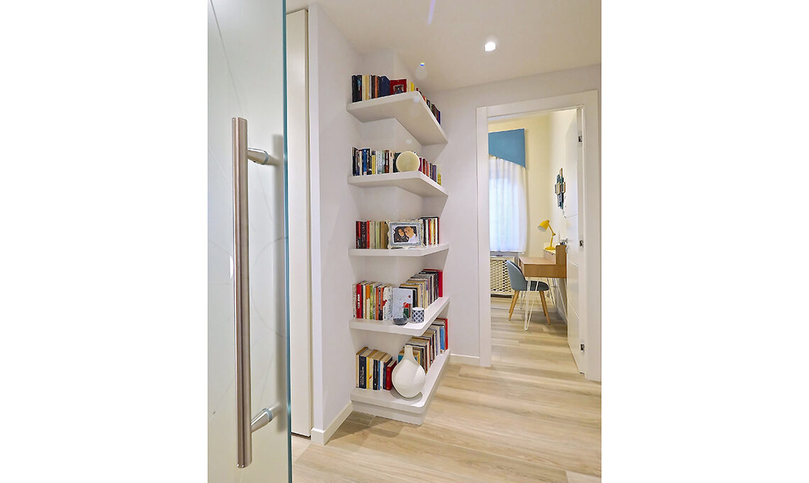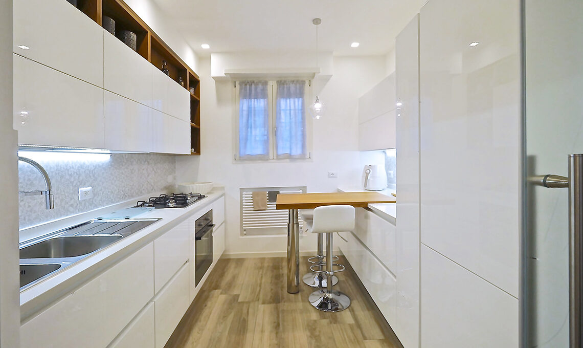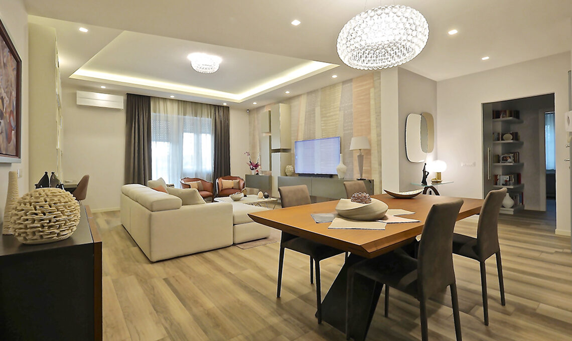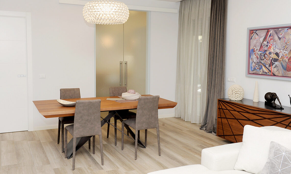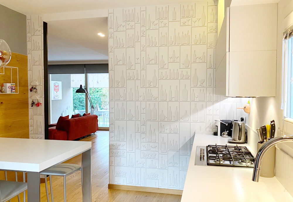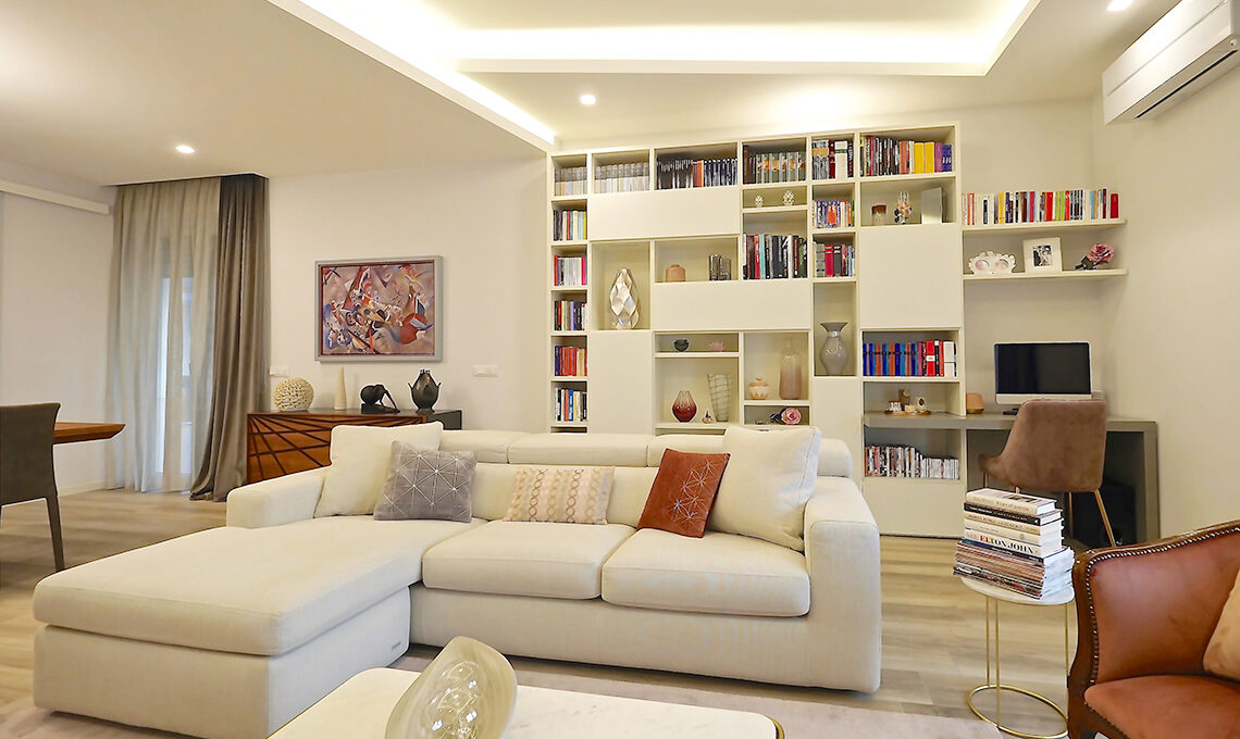 È stato ricavato un grande open space luminoso e separato dalla cucina attraverso una porta a vetri. Completano l'appartamento tre camere da letto, tre bagni e un doppio ingresso. Infatti, seppur collegata al resto della casa attraverso una porta scorrevole, una porzione dell’appartamento che comprende un disimpegno e una stanza da letto con bagno, è stata pensata per ospitare amici e parenti offrendogli una maggiore privacy.