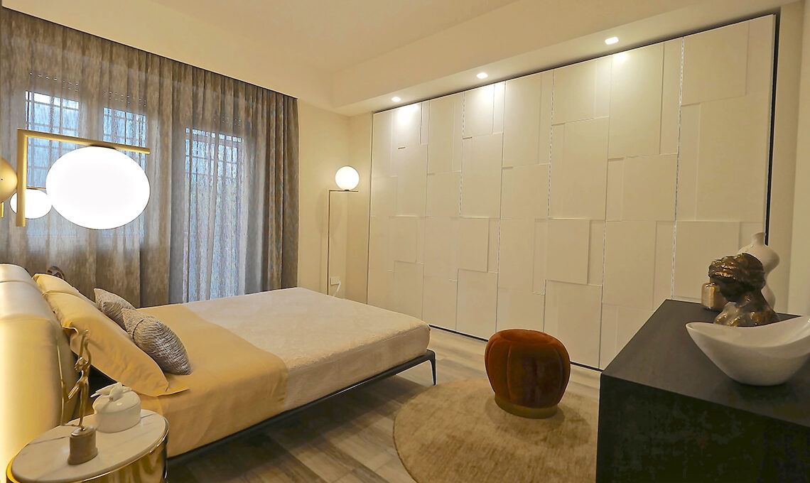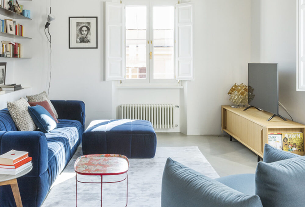 È stato ricavato un grande open space luminoso e separato dalla cucina attraverso una porta a vetri. Completano l'appartamento tre camere da letto, tre bagni e un doppio ingresso. Infatti, seppur collegata al resto della casa attraverso una porta scorrevole, una porzione dell’appartamento che comprende un disimpegno e una stanza da letto con bagno, è stata pensata per ospitare amici e parenti offrendogli una maggiore privacy.