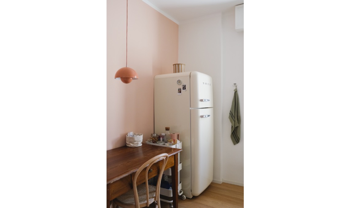 Marianna ha scelto di dipingere una parete della cucina di rosa, colore che mette in risalto il frigo anni ‘50 di Smeg. «La lampada Flowerpot di &Tradition è stata acquistata ancora prima della ristrutturazione: ho una vera passione per l’illuminazione».