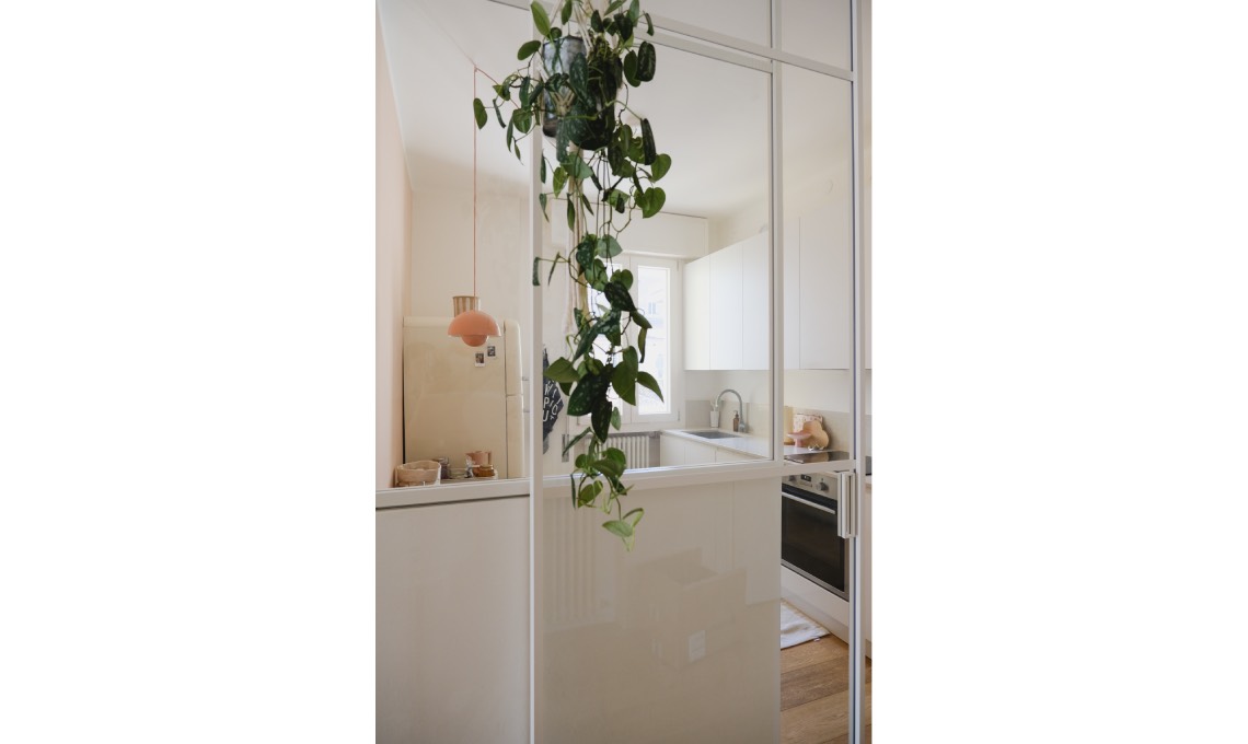 «Una caratteristica che ho sempre immaginato nella mia casa è la porta a vetro in cucina: volevo mantenere gli ambienti separati ma lasciare la luce entrare in ingresso» dice Marianna.