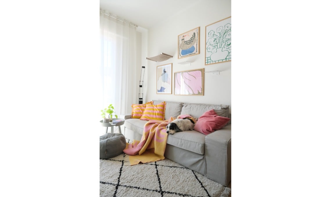 Un'altra caratteristica della casa sono gli accessori pet: «Nora e Burro vivono la casa molto più di me e ho voluto renderla ricca di stimoli senza rinunciare al design. Sopra il divano, tra le stampe di PSTR studio, c’è la parete di arrampicata di LucyBalu, dove Burro passa moltissimo tempo supervisionando la casa. Nora ha la lussuosissima cuccia di Miacara design ma passa molto più tempo sul divano, ammetto».