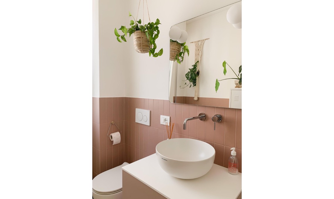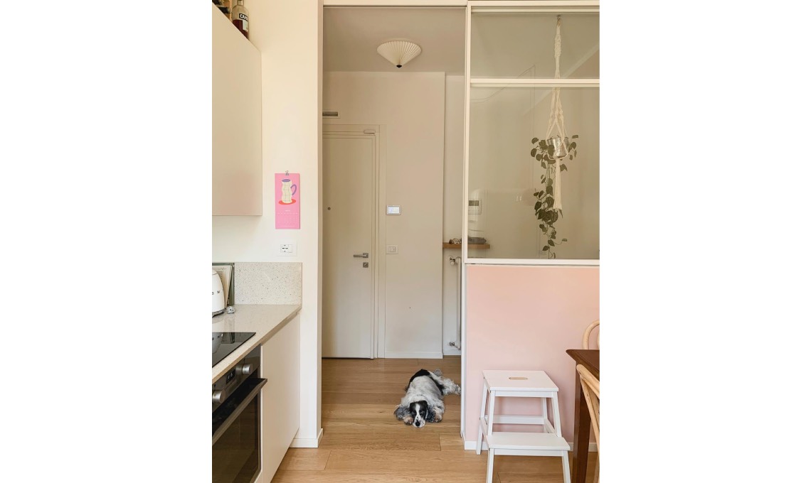 «Un’altra caratteristica che ho sempre immaginato nella mia casa è la porta a vetro in cucina, volevo mantenere gli ambienti separati ma lasciare la luce entrare in ingresso e mettere in risalto la mia parete rosa e il frigo anni ‘50 Smeg. Ho diversi pezzi di recupero che scaldano molto gli interni, i miei preferiti sono la madia in ingresso e l’armadio in salotto con sopra le piante. In salotto ho tenuto dal mio precedente appartamento il divano Ikea che resta un grande acquisto, è comodissimo!».