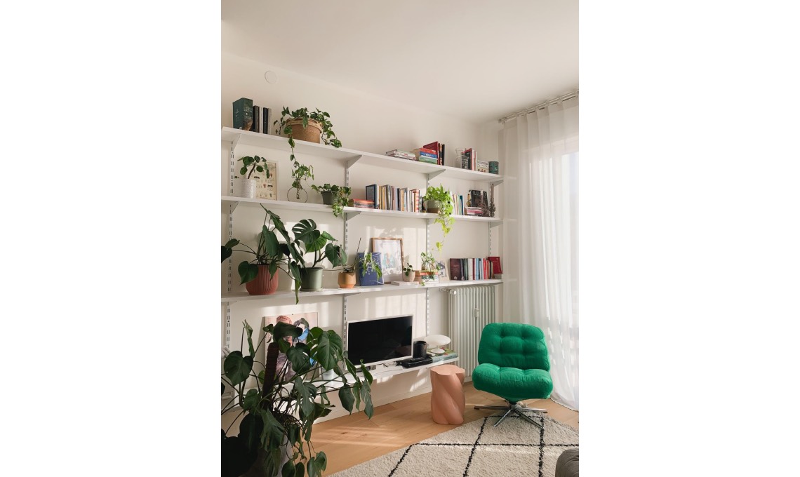 Nel living Marianna voleva anche una libreria in cui appoggiare la tv ma che andasse quasi a sparire tra le tante piante, libri e i suoi oggettini 'carini'. «Avevo esaurito il budget perciò questo è il mio progetto low cost migliore: cremagliere di Leroy Merlin e mensole fatte da un falegname e dipinte da mio nonno! Il tocco pop è sicuramente la poltrona in velluto verde bandiera di Ikea, la preferita del mio gatto».