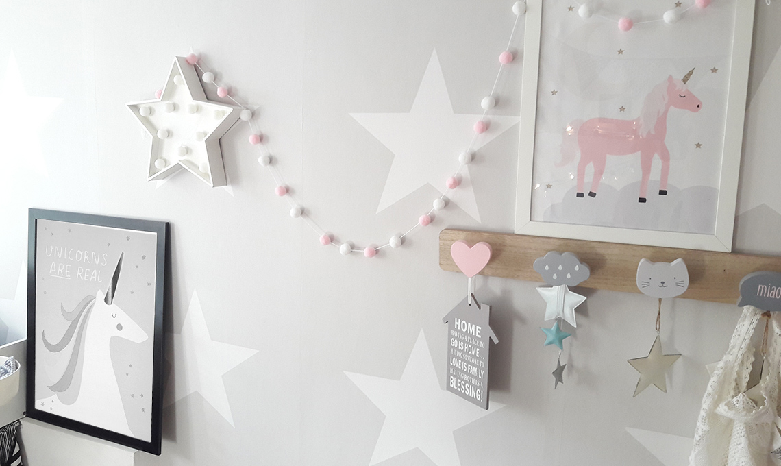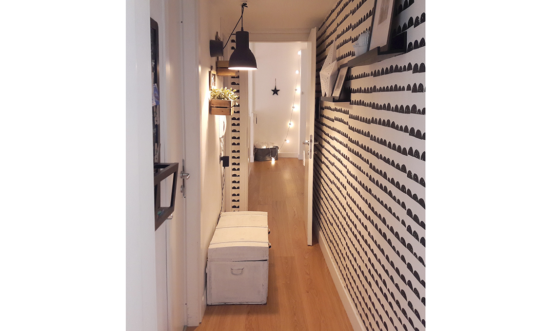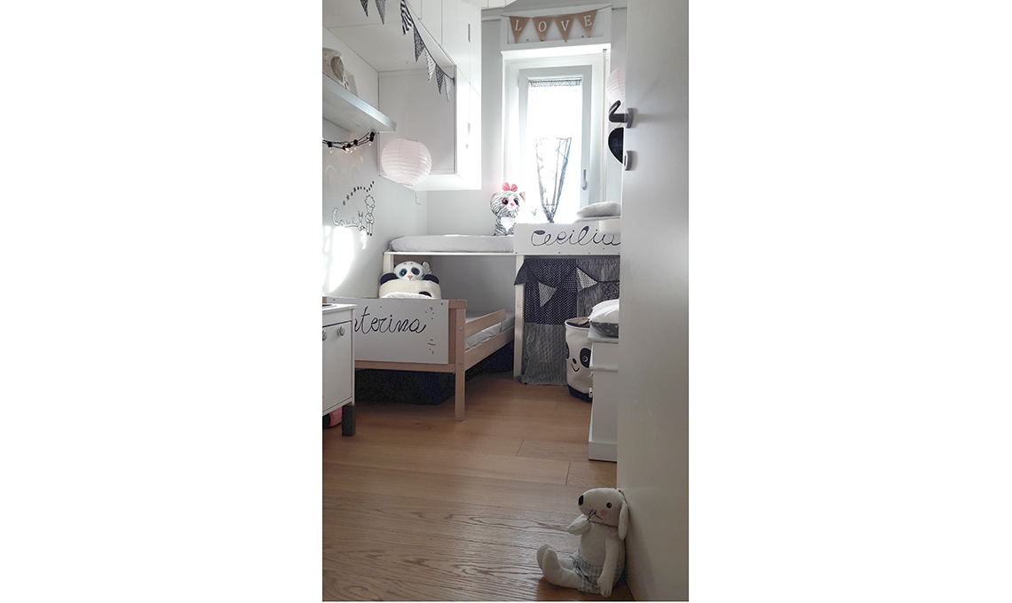 La zona giorno e la zona notte sono separate da un corridoio decorato con carta da parati in stile nordico con mezze lune nere su fondo bianco. L'ex cucina è stata trasformata nella cameretta delle bambine, uno spazio piccolino ma super funzionale. C'è un lettino per la più piccola e un letto rialzato su misura (un progetto di 'fai da te') per la grande. A destra c'è anche una piccola area giochi chiusa da una tenda e tutta la stanza è decorata con una carta da parati grigia con grandi stelle bianche. La camera da letto principale, molto semplice e sobria è arricchita da una panca, una sedia a dondolo e dalla stufa ereditata dalla nonna.