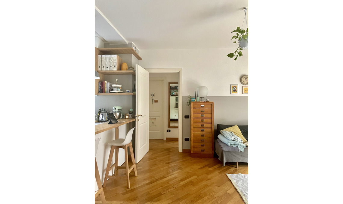«Certo, avremmo potuto trasformare lo studio in una seconda cameretta, direte voi, ma la verità è che, inspiegabilmente, ci trovavamo i figli sempre calamitati nella zona giorno, perciò abbiamo optato per un living più luminoso con i due balconi uno di fronte all’altro, più ampio e versatile per tutti gli usi: rilassarsi, studiare, lavorare, giocare, cucinare, tutti insieme appassionatamente… finché l’adolescenza non ci separi. Ora l’adolescenza del primo figlio è arrivata».