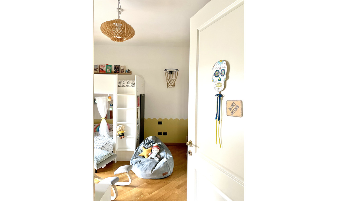 La cameretta dei figli era in origine la camera matrimoniale, ma Barbara e suo marito hanno deciso di 'cederla' ai ragazzi. Un letto a castello ha permesso di guadagnare spazio per una postazione relax e per un canestro.