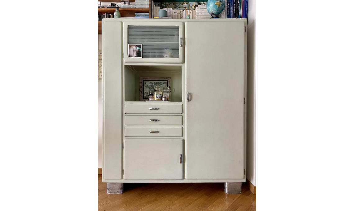 I comodini sono stati sostituiti da piccoli sgabelli in legno di betulla costruiti dal papà di Barbara quando era bambina e da una pratica mensola dietro la testiera del letto costruita dal marito, come gli scaffali porta documenti e il mini piano d’appoggio per brevi sessioni di lavoro online. «Abbiamo anche una postazione pc inserita nei moduli della libreria, fatta costruire da un amico falegname, intorno ad una credenza anni ’50 scovata in un mercatino e ristrutturata da noi».