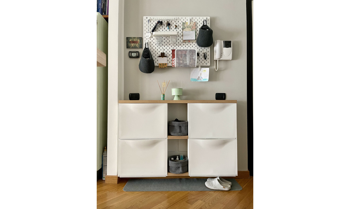 Barbara ha sfruttato al massimo ogni angolo del suo trilocale e anche l'ingresso è super attrezzato. Con un mobile scarpiera con piano d'appoggio e una bacheca Ikea dove appendere borse, chiavi, bloc notes e tanto altro! Da notare: il mobile non tocca a terra, così si ricava anche spazio per riporre le pantofole.