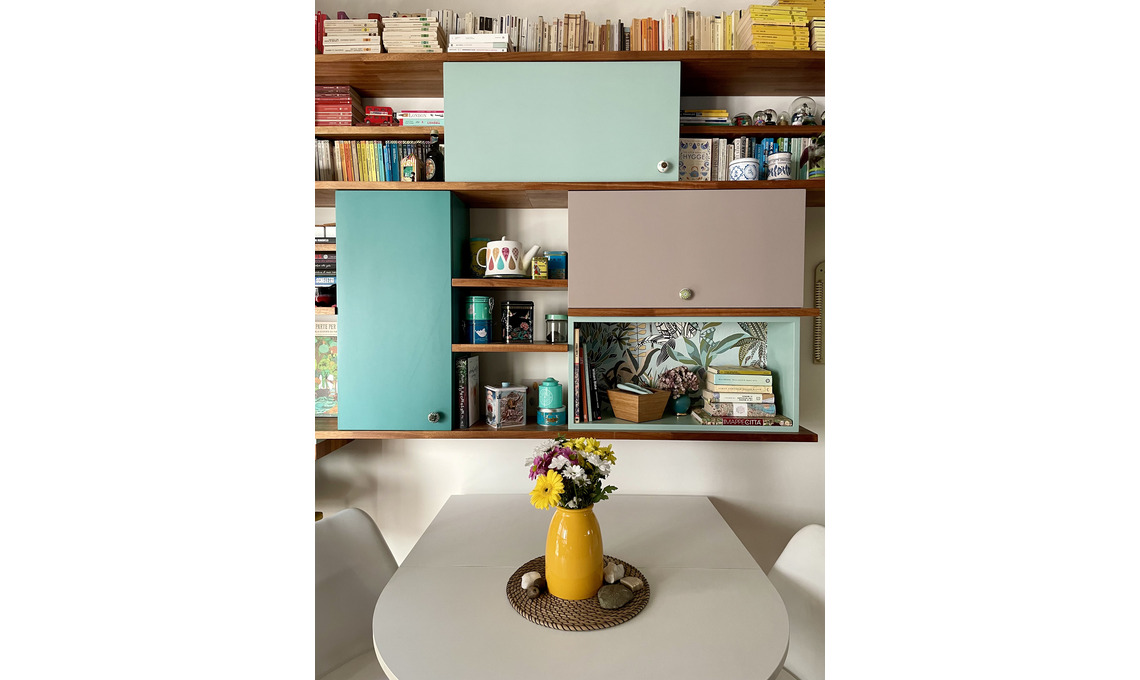 La libreria su misura sospesa permette di sfruttare anche lo spazio sotto: copia l'idea di 'muoverla' con alcune antine colorate e di decorarla con una carta da parati sul fondo.