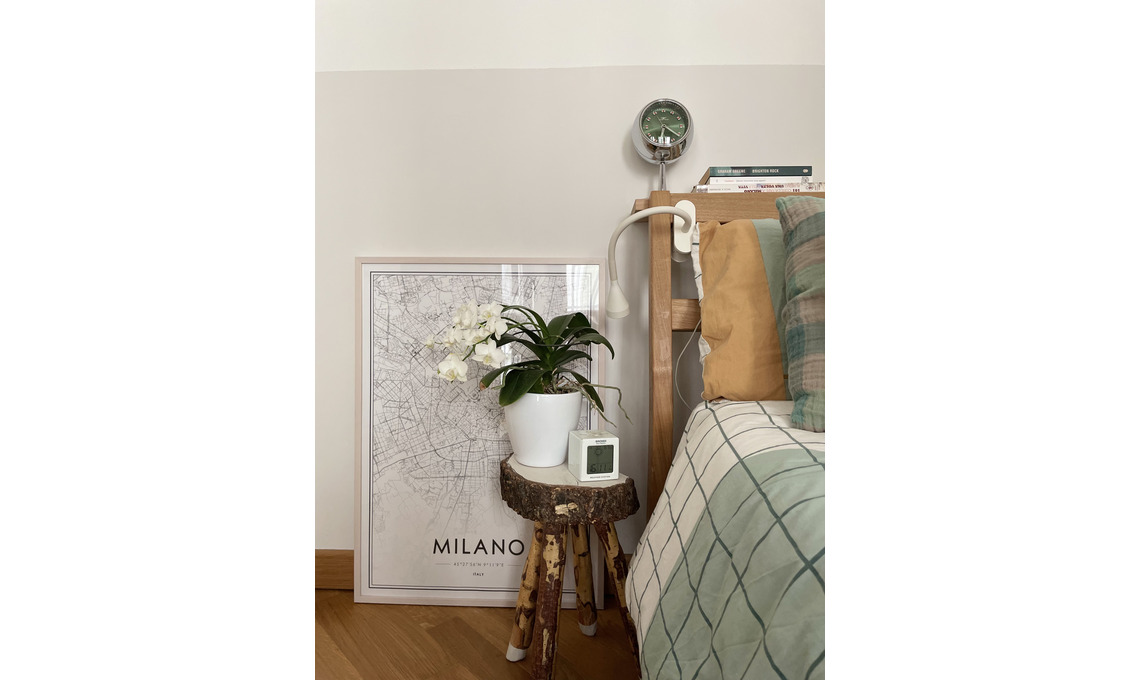 Nella camera matrimoniale i comodini sono stati sostituti da piccoli sgabelli in legno di betulla costruiti dal papà di Barbara quando era bambina e da una pratica mensola dietro la testiera del letto costruita dal marito.