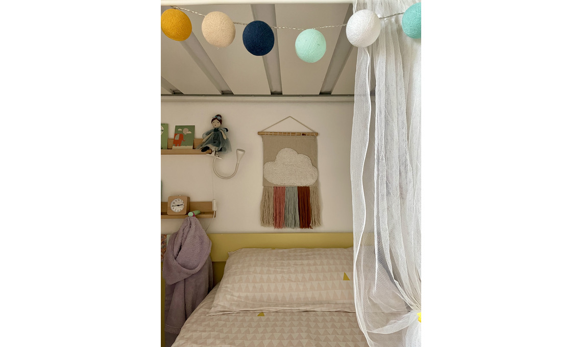 Sotto al letto a castello c'è un... mondo di dettagli romantici! Dalle luci colorate appese al filo all'arazzo alle mensoline dove riporre libri e ricordi.