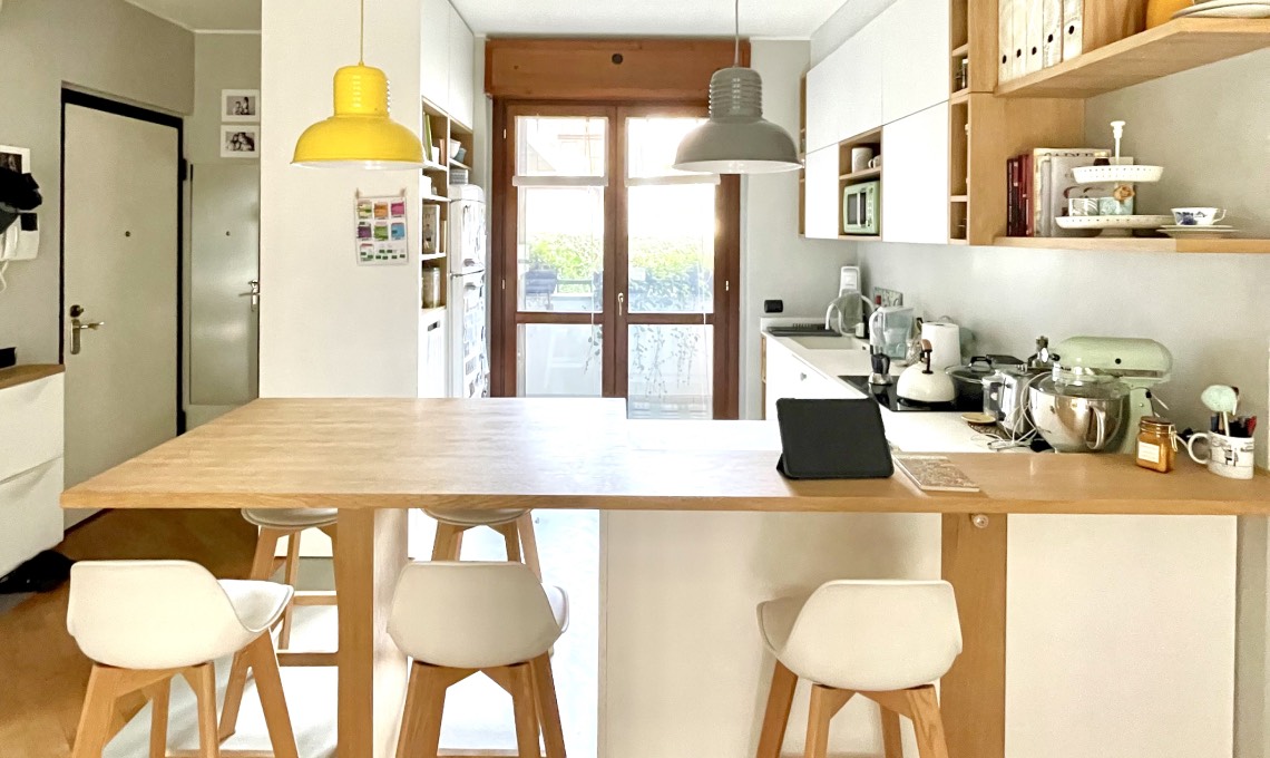 La cucina aperta sul living con bancone snack è l'ultimo cambiamento realizzato da Barbara, nostra lettrice storica, nella sua casa di Milano dove ha vissuto per 15 anni.