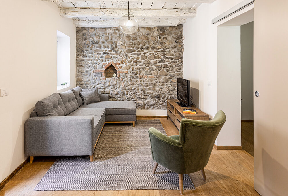 In questa ristrutturazione, mattoni, legno, pietre e cotto, i materiali antichi e originali della struttura, sono stati recuperati con grande cura.