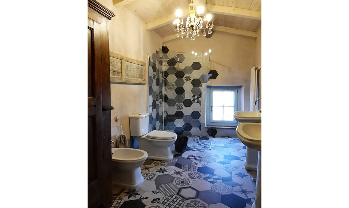 "Entrando abbiamo lasciato il vecchio pavimento in cementine decorate che curo e conservo come un avere prezioso. Le pareti erano intonacate ma dove possibile abbiamo riportato le pietre a vista. Anche il soffitto era nascosto da un canniccio intonacato e anche qui abbiamo provveduto a toglierlo per lasciare la naturale bellezza delle travi a vista".