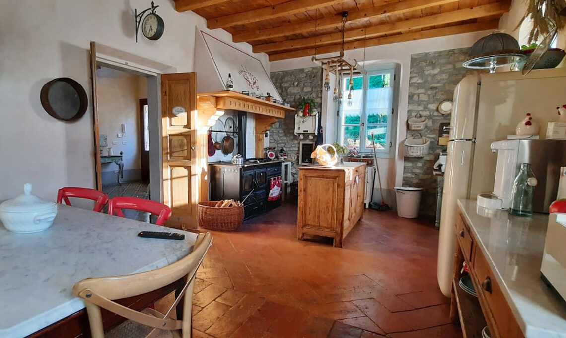 "La cucina, vero cuore della casa, ha una notevole dimensione, anche qui si trovano travi in legno e pavimento in cotto, per renderla ancora più calda abbiamo voluto una cucina a legna che ci scalda ininterrottamente da ottobre fino a marzo. Abbiamo una grande stufa anche nel salone perfetta nella stagione fredda stagione e molto decorativa in estate. Abbiamo scelto la legna proprio per rimanere il più possibile consoni all'essenza della casa."