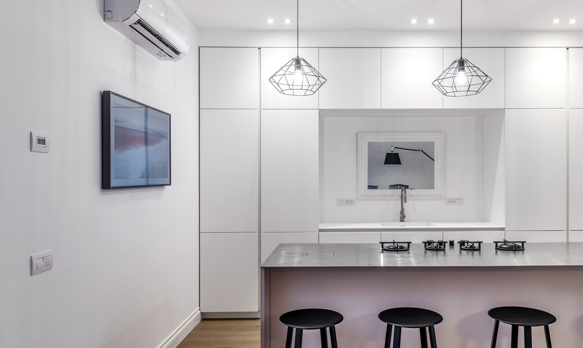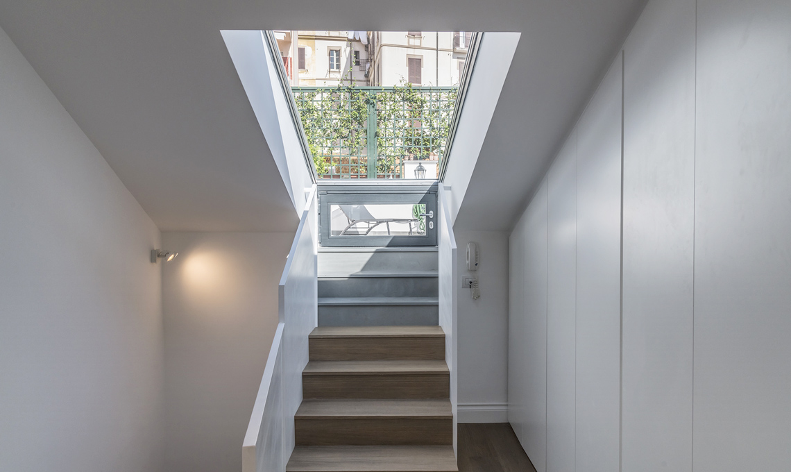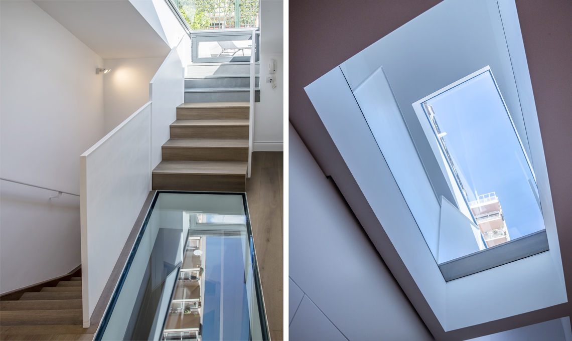 Un progetto a sviluppo verticale che porta dal primo livello al terrazzo sul tetto, attraverso una scala interna caratterizzata da trasparenze di vetro pensate per non nascondere mai il cielo azzurro di Napoli.