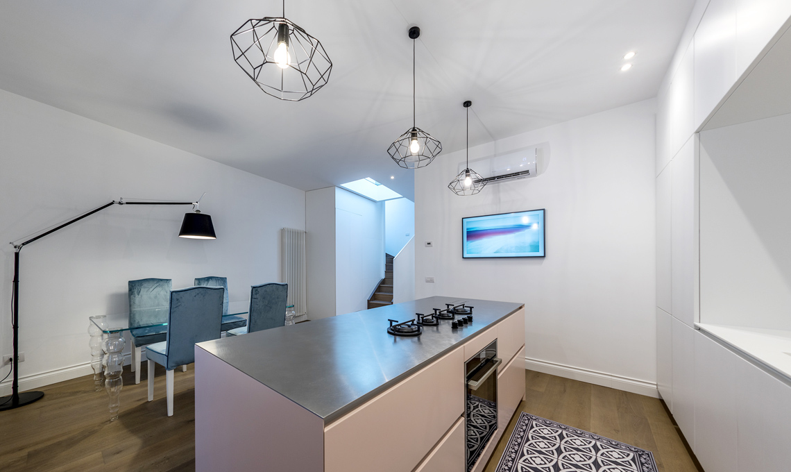 La scala centrale funge da filtro alla zona pranzo, con l'isola in acciaio e legno laccato rosa che domina lo spazio destinato alla cucina.