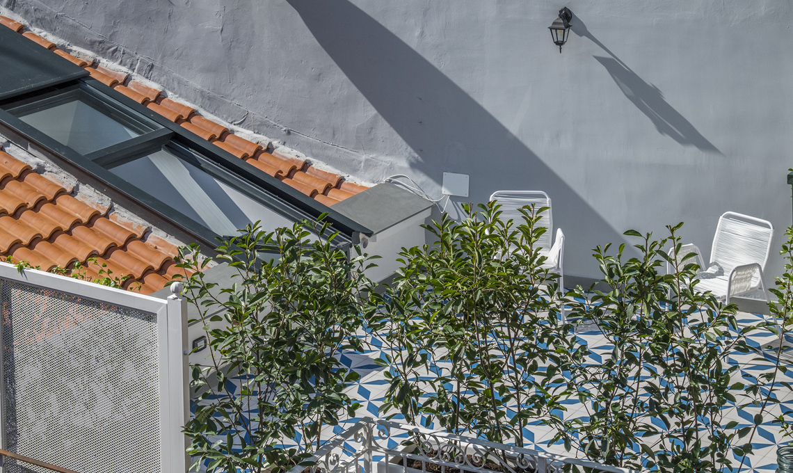 Al terzo livello si arriva al bellissimo terrazzo dove le piastrelle a decori geometrici nei toni del blu rimandano al mare e alla tradizione artigianale napoletana.