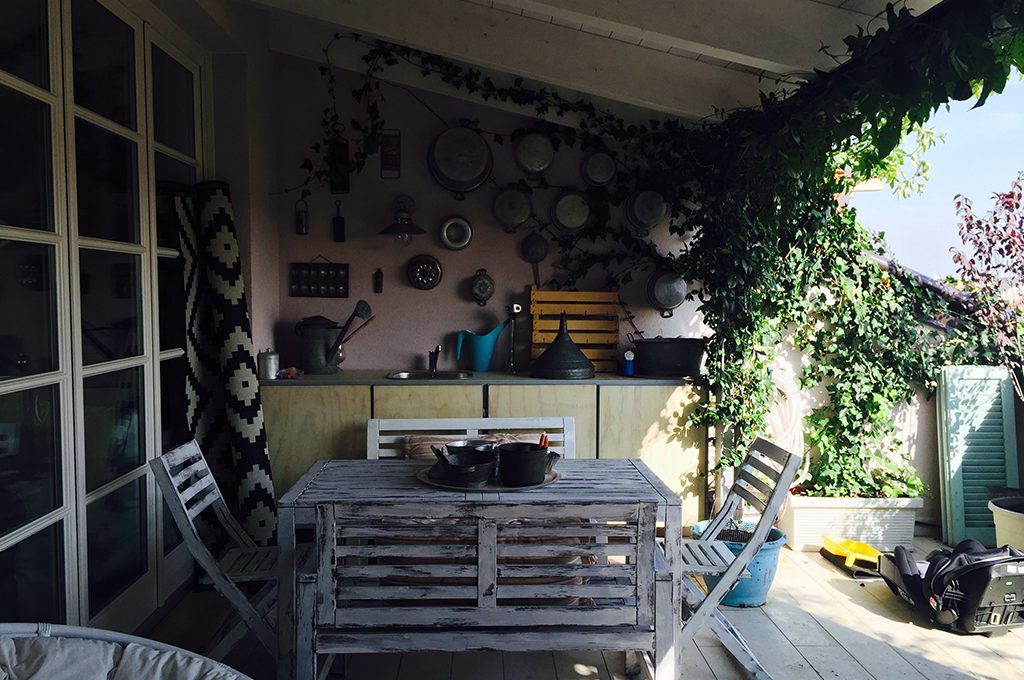 Abbiamo aperto tutta l’area del soggiorno e della sala pranzo in uno unico grande spazio che si affaccia sulla terrazza davanti ai tetti della città, da dove entra una bella luce in casa. Lì abbiamo il nostro pezzo di campagna in mezzo ai limoni e frutti di bosco che crescono nei vasi al sole.