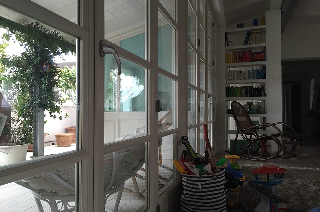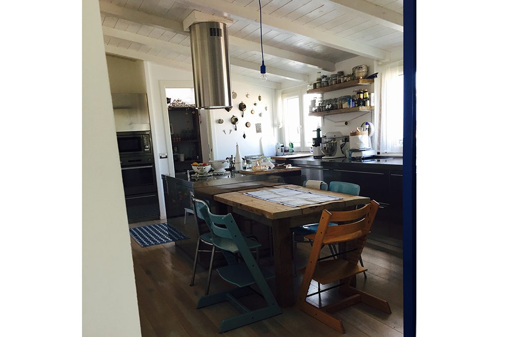 La cucina è il centro e il cuore della casa e per quello volevamo che fosse aperta sul living; perciò gli architetti hanno creato un'anta scorrevole, fatta su misura in ferro e vetro, che ci dà la possibilita di stare tutti insieme anche se la chiudiamo.