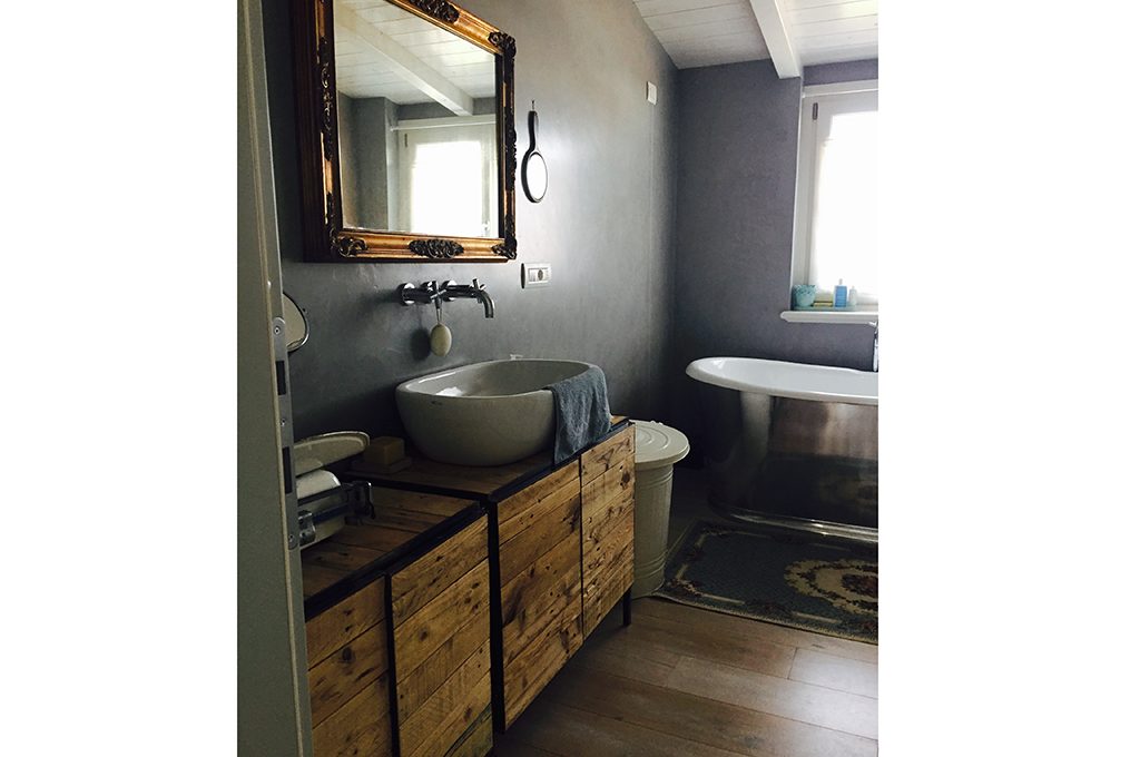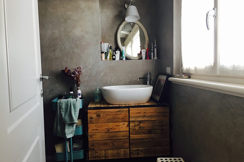 La zona notte è molto più riservata, separata dall’ingresso con un’anta di legno grezzo. La casa ha 3 stanze da letto, la matrimoniale ha un bagno privato. Sul corridoio ci sono altri due bagni, uno per i bimbi e altro più piccolo per le visite. Abbiamo scelto di rivestirli in resina con un effetto di cemento che abbinato ai mobili in ferro e legno grezzo risulta in uno stile industrial chic che ci piace molto.
