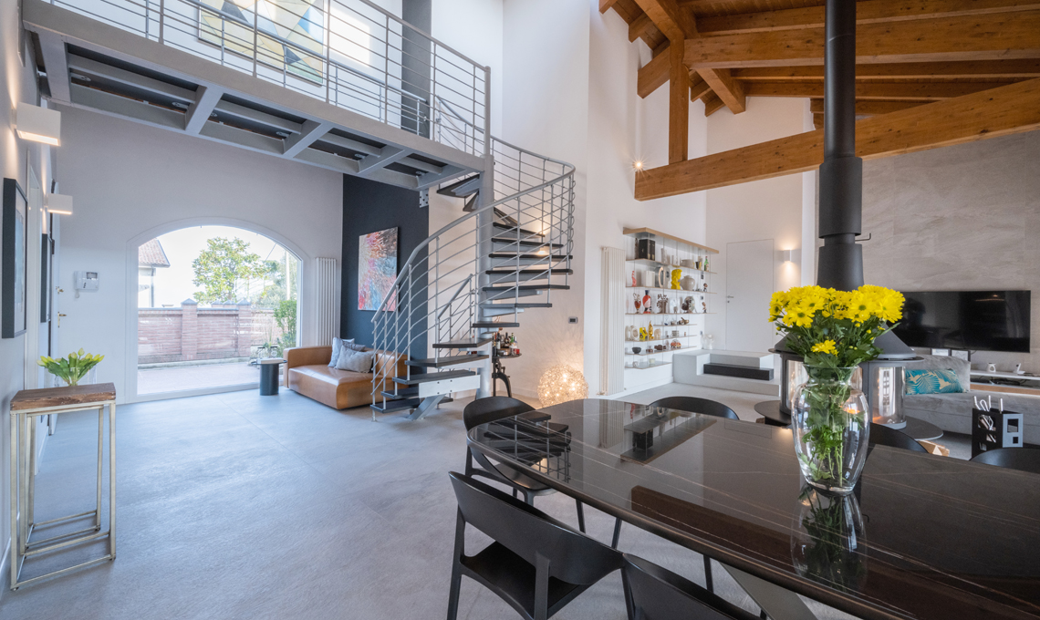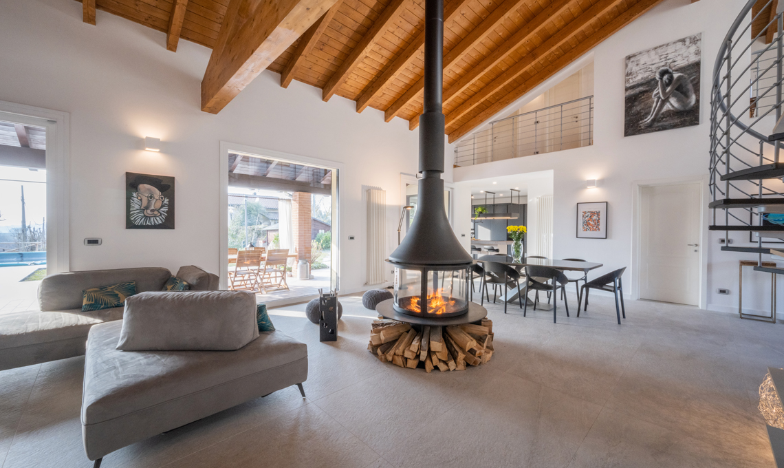 L'ingresso dà sul soggiorno, dove il protagonista è certamente il camino circolare nero al centro, che divide i grandi spazi del living, tra zona salotto e zona pranzo.