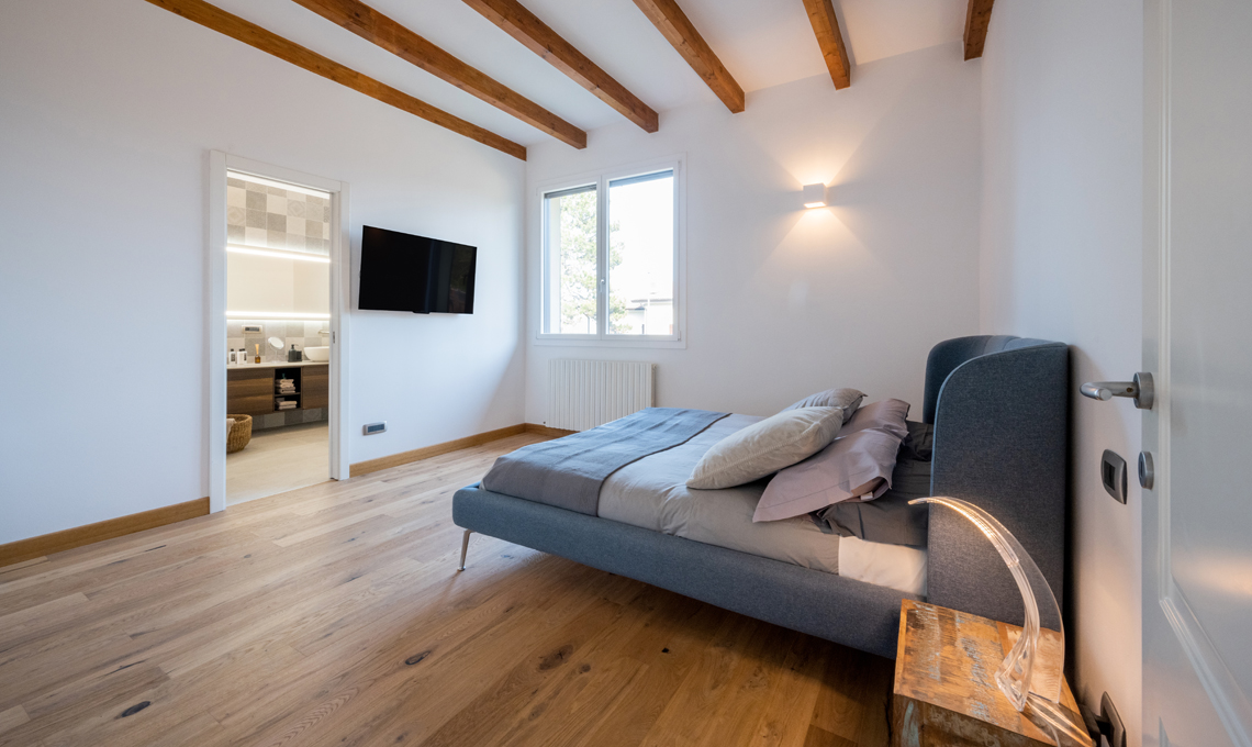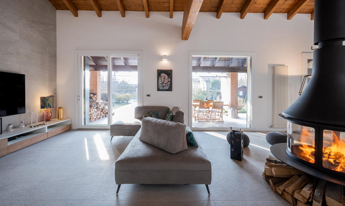 Così, gli interni sono caratterizzati da uno stile minimal, ma i materiali (pavimenti in gres porcellanato effetto pietra e parquet, travi a vista) dialogano con lo stile dell'esterno della casa, che Lorenzo ama definire 'country charme'.