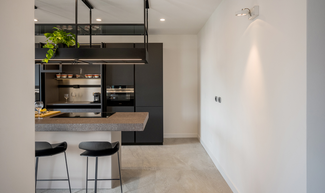 Anche la cucina è tutta nera, con una grande isola affacciata sull'esterno.