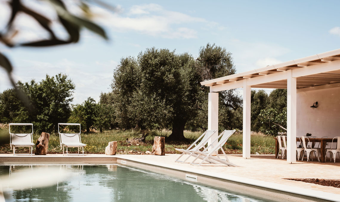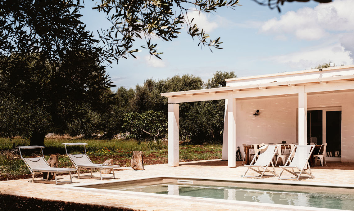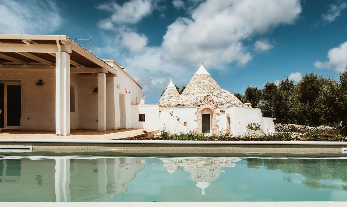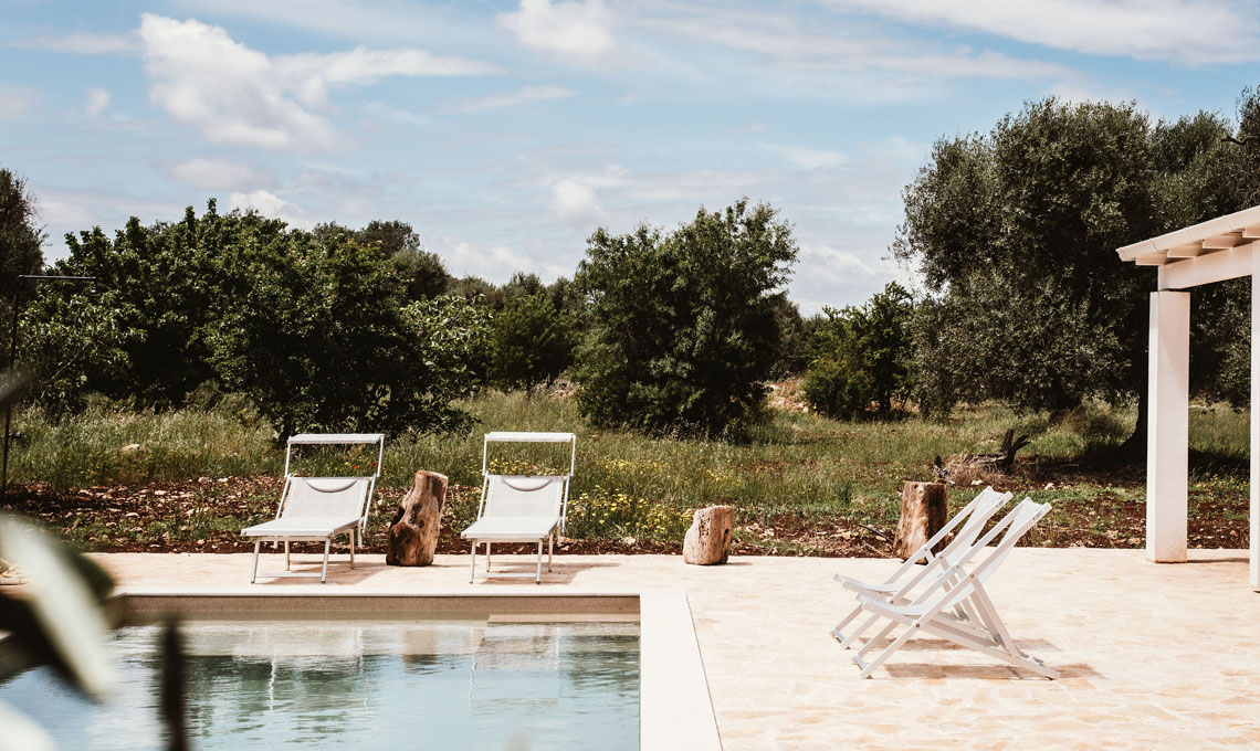 Di fronte al trullo e al patio è presente una grande piscina con lo sfondo chiaro, che richiama il colore della sabbia di Ostuni. Nella piscina sono presenti degli scalini e accanto uno spazio dove poter prendere il sole, immersi nell’acqua. Attorno alla piscina è presente una doccia esterna, dei bianchi vasi dove sono stati inseriti grandi pale di fichi d’india e un vasto prato verde.