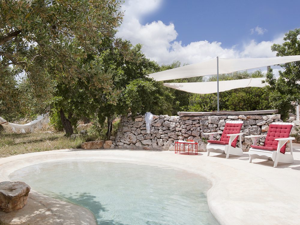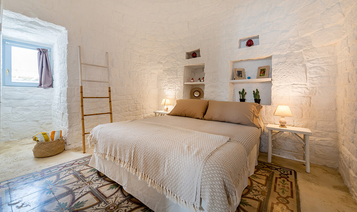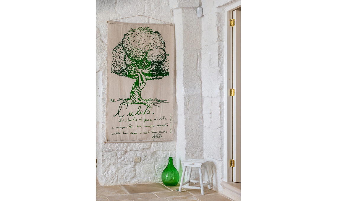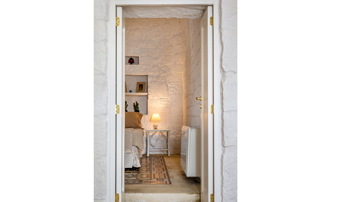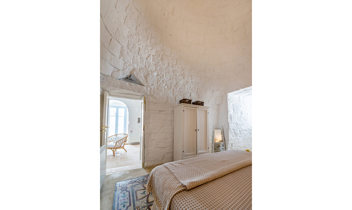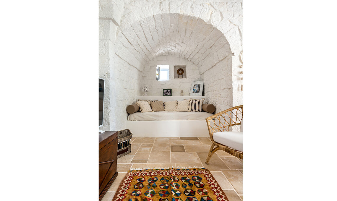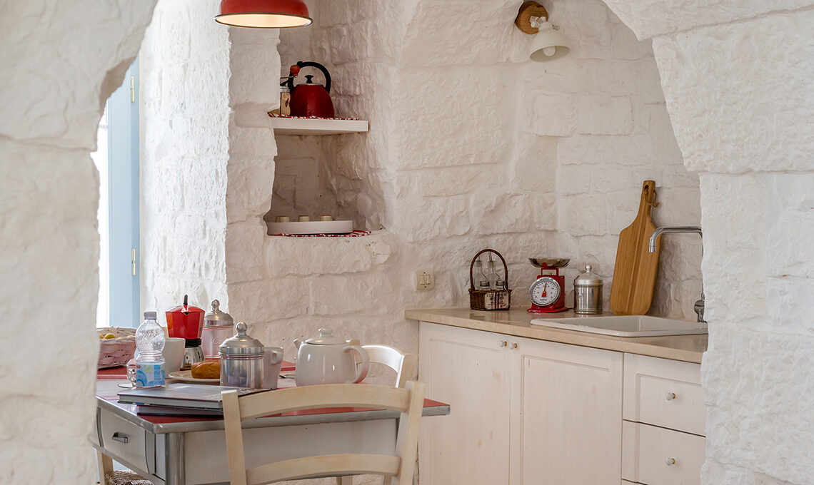 "I pavimenti sono in pietra di Trani, a parte una camera da letto che conserva il vecchio pavimento in cementine che siamo riusciti a recuperare. La pietra delle pareti, sia all'interno che all'esterno, è a vista, è stata solo pulita e dipinta di bianco e conferisce alla casa un'atmosfera elegante, essenziale e fresca. Questa è la sensazione che volevamo ritrovare in ogni ambiente, questo senso di leggerezza, semplicità e freschezza che ha guidato anche la scelta degli arredi. Il nostro desiderio era quello di una casa essenziale, non appesantita da troppi mobili, ma allo stesso tempo pratica e confortevole. Ogni cosa è stata scelta da noi, tra mercatini e piccoli negozi tra Milano e la Puglia. La scelta nei colori degli arredi si è ispirata alla terra pugliese: il rosso, il marrone, il verde, l'ocra. Per la grande cucina che affaccia sul pergolato abbiamo voluto un azzurro tenue che accostato al bianco, la rende luminosa e fresca, pronta ad accoglierci per cucinare in allegria o cenare quando le sere sono più fresche. Abbiamo ricavato una seconda cucina per rendere indipendente uno dei trulli, qui abbiamo scelto di abbinare il bianco al rosso per renderla allegra e accogliente."