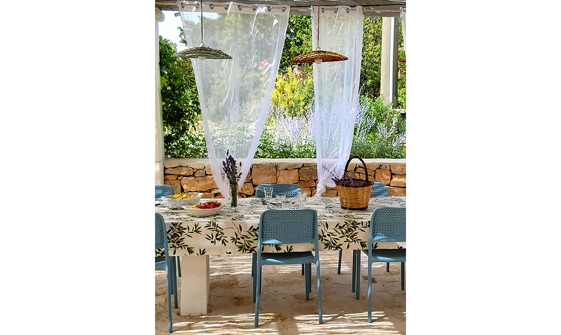 Ovviamente anche l'esterno è curatissimo e in estate è qui che si passa la maggior parte del tempo: "Abbiamo voluto un grande patio davanti alla cucina dove poter pranzare e cenare, il tavolo in muratura e legno è stato realizzato da artigiani del luogo. Il risultato finale è stato quello di poter vivere una dimora antica, ma con tutti i comfort".