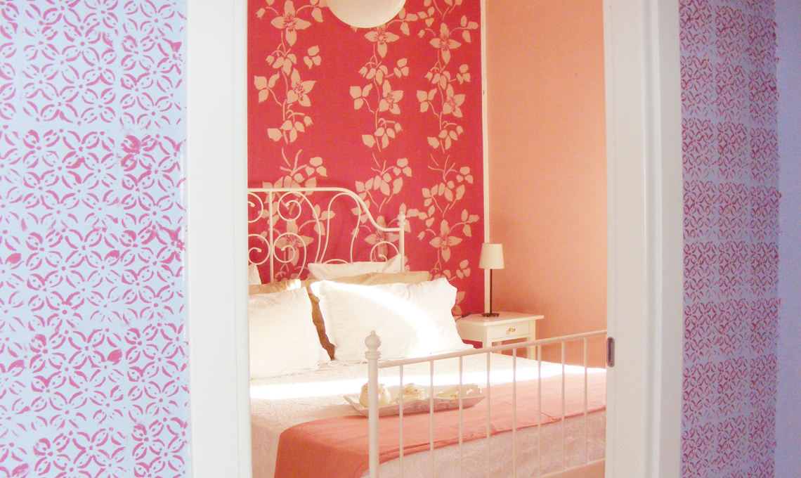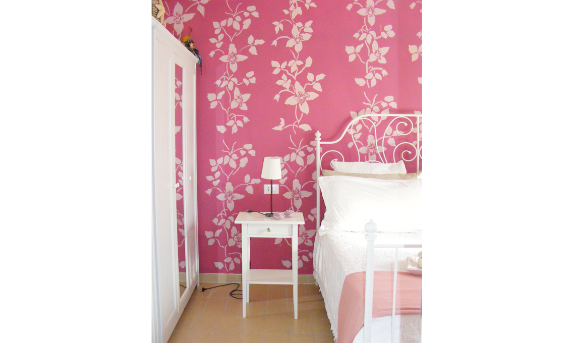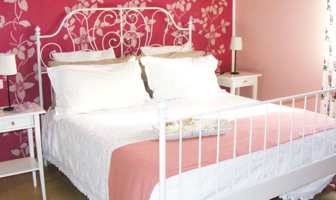 In camera sono i toni del rosa a rendere accogliente la stanza con carte da parati décor e il letto in ferro battuto bianco.