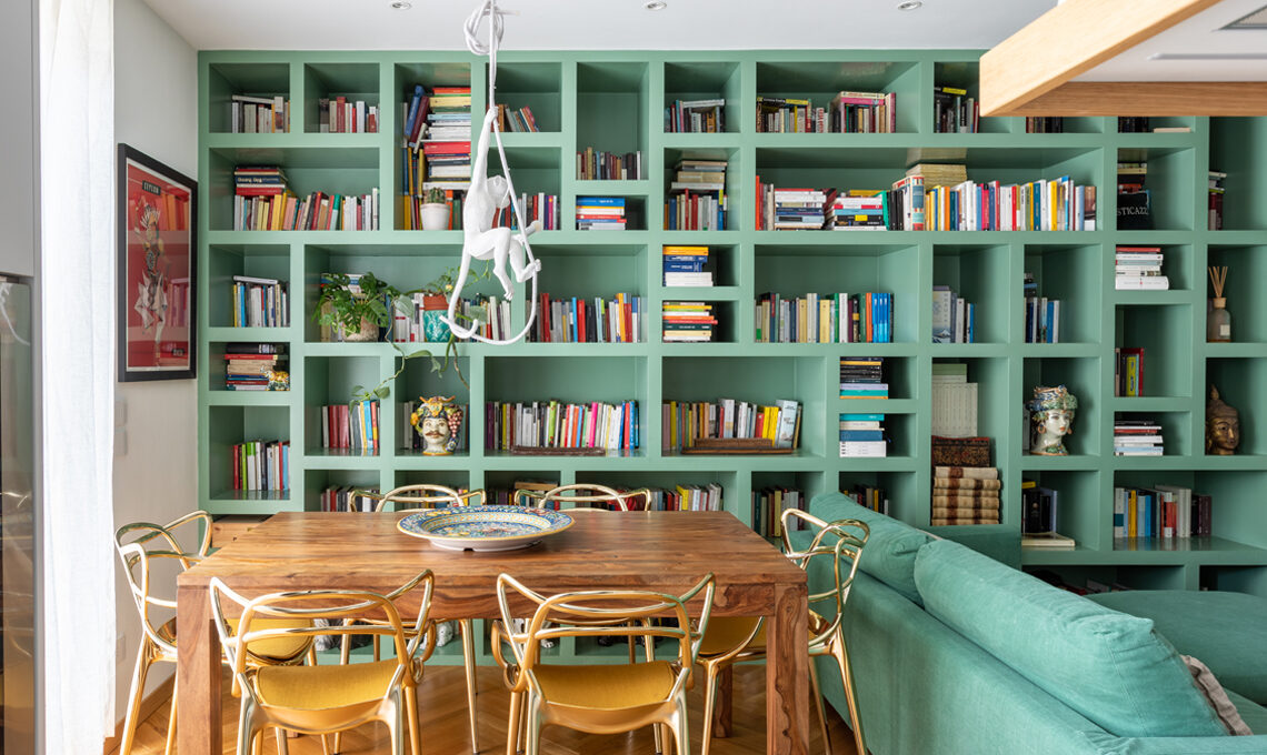 Libreria su misura verde RAL R6021; tavolo da pranzo di famiglia; sedie Master Metal color oro [Kartell]; Lampadario Monkey Lamp [Seletti]. Il tocco in più: sul tavolo e nella libreria ceramiche siciliane e teste di moro