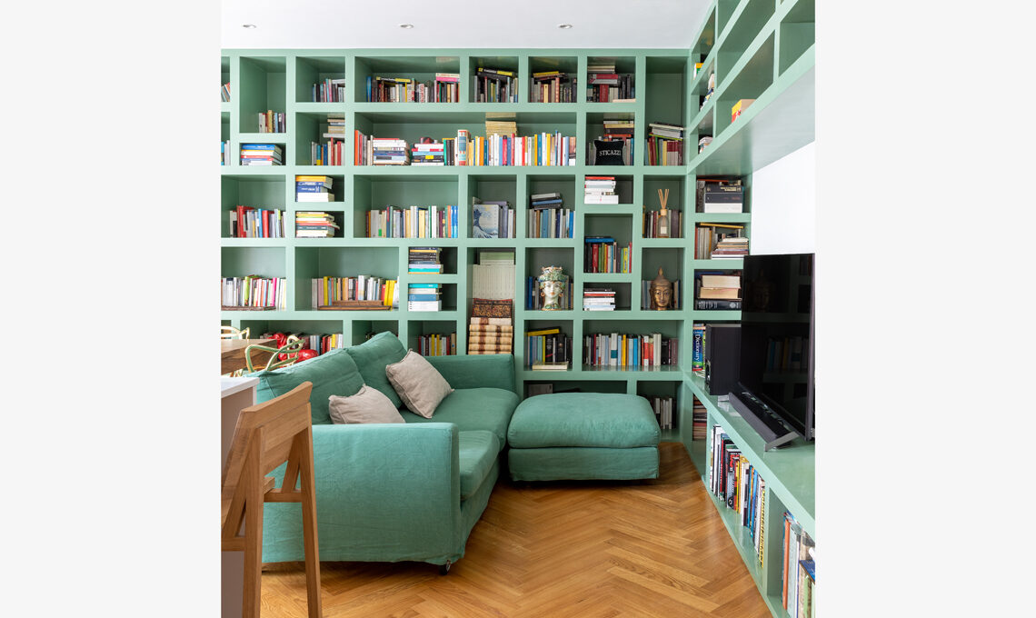 La domanda che certamente ti stai facendo: che tonalità di verde è stato utilizzato per la grande libreria su misura? Si tratta del RAL R6021.