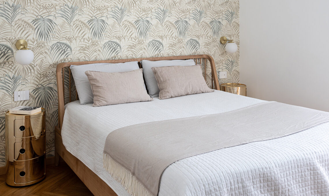 L'icona di design: il Componibile [Kartell] utilizzato come comodino; letto con struttura in legno massello [Ethnicraft, da Design Republic]; lampade da parete in vetro opaco e ottone [Westwing]; carta da parati in seta [JV Exclusive, Jannelli & Volpi]