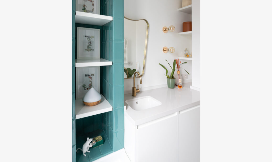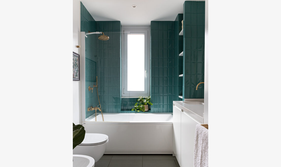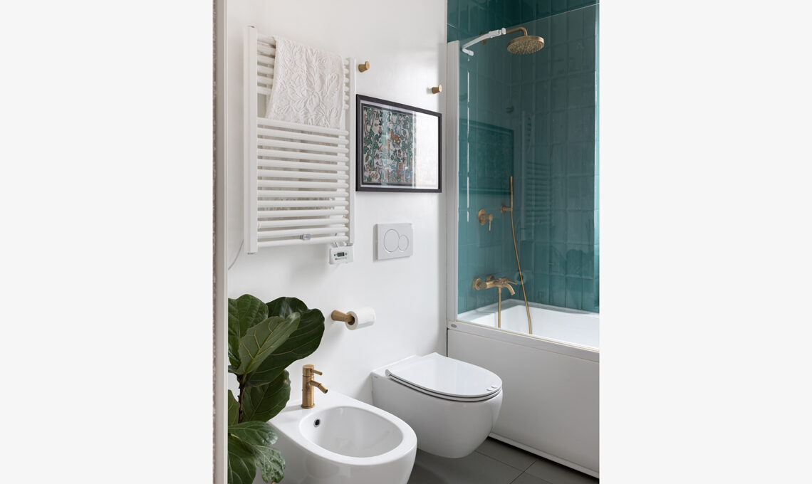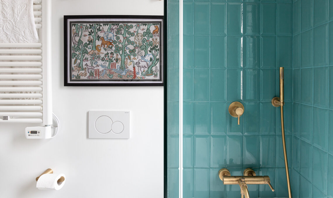 Un dettaglio del bagno, con piastrelle turchesi e rubinetteria Bambù in finitura dorata spazzolata [Bellosta]; al muro un ricordo di viaggio dalla Birmania.