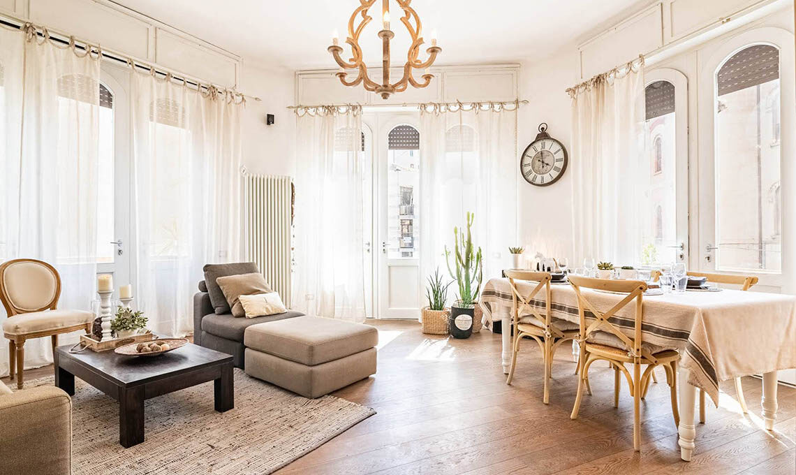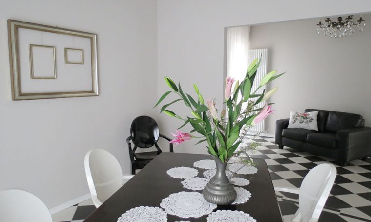 L'appartamento di 90 mq dove vive Michela ha un taglio più tradizionale, composto da un disimpegno e antibagno ribassati con ripostiglio, un bagno, una camera da letto con armadio angolare, una cucina con soprapensili in cartongesso e una sala pentagonale luminosissima con 3 trifore e tre balconi.