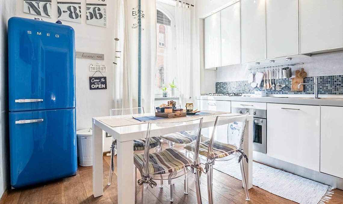 Nel loft di 60 mq sono invece stati recuperati una zona giorno con cucina a vista, un soppalco (con sotto cabina armadio e lavanderia) e un bagno. Le finestre a tutta altezza e la quasi totale assenza di pareti divisorie rendono l’ambiente molto luminoso e otticamente molto ampio.