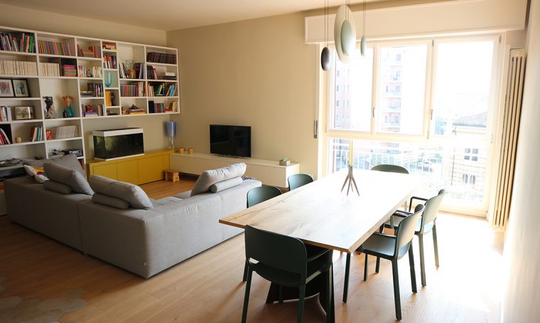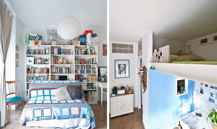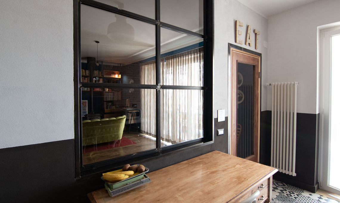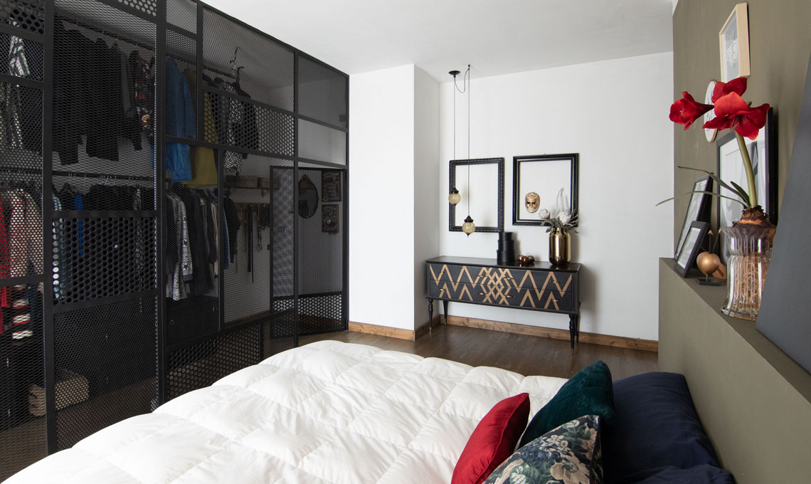 Per la libreria ho riciclato dei cubi di legno di una vecchia libreria e ho aggiunto dei pilastri di ferro lasciato al colore naturale. Il ferro è un elemento che amo tantissimo e molto presente nell'appartamento. In camera da letto ho progettato la cabina armadio ispirandomi alle composizioni di Mondrian, creando delle texture di reti che lasciano trasparire luce e leggerezza.