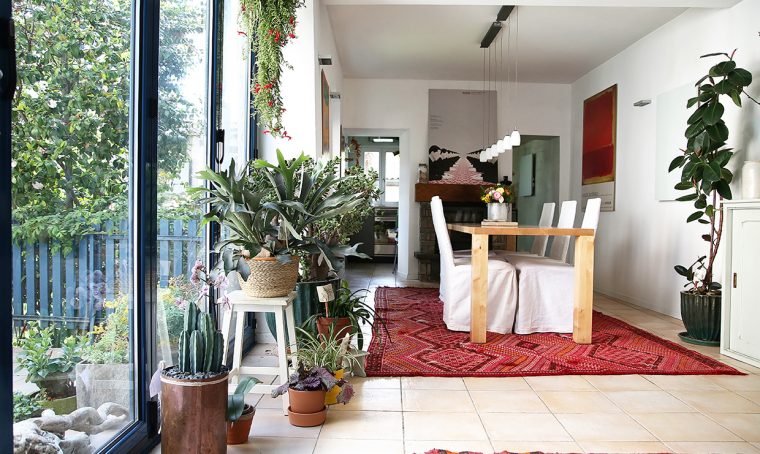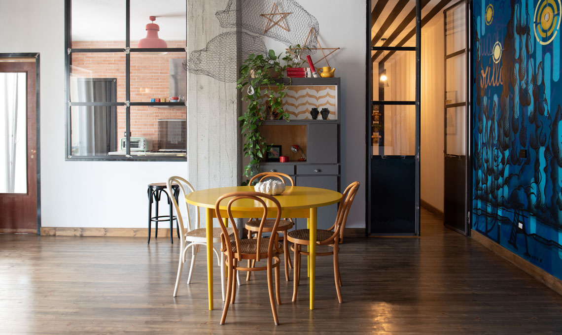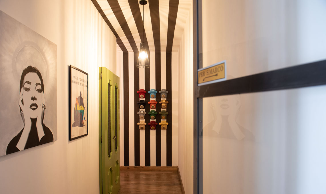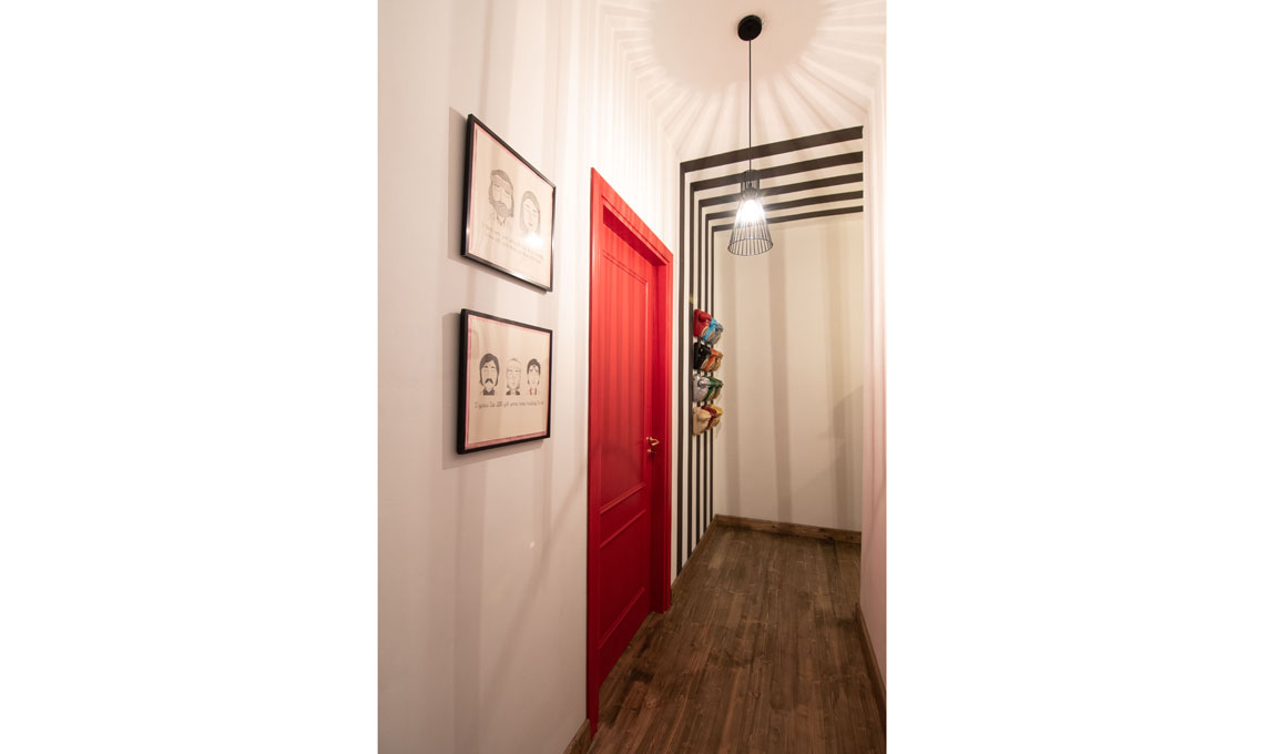 Nel corridoio ho giocato con righe al soffitto che si spingono verso il salone, ironizzando sul ruolo angusto che spesso ha questo ambiente, aggiungendo porte colorate, anch'esse riciclate.