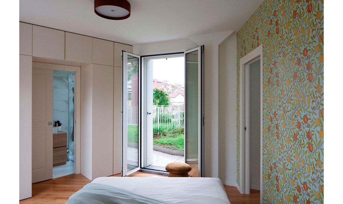 L'armadiatura è realizzata su misura per sfruttare al centimetro lo spazio: di tonalità neutra, ha un vano di accesso al bagno privato di Paola. Come per le altre stanze, anche questa ha una uscita sul verde.