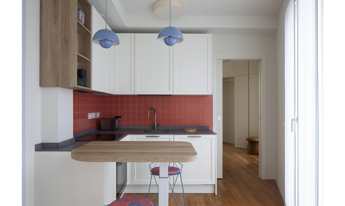 La cucina non è molto grande ma ha la fortuna di affacciarsi su due terrazzi ed è piena di luce naturale. Le piastrelle richiamano l'arancione vivace del soggiorno, abbinato a un blu spento che si ritrova nelle lampade sospese Flowerpot di 1969 Tradition. Gli sgabelli di metallo, realizzati su misura e assemblati da Davide Marco Ferrari, sono abbinati a cuscini con la stampe “Sushi” disegnata per Ciasmo da Paola.